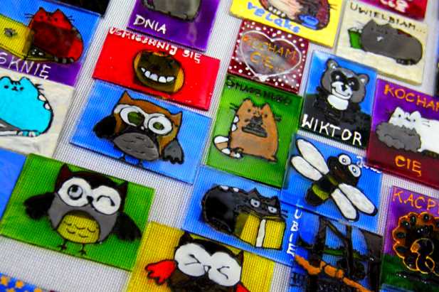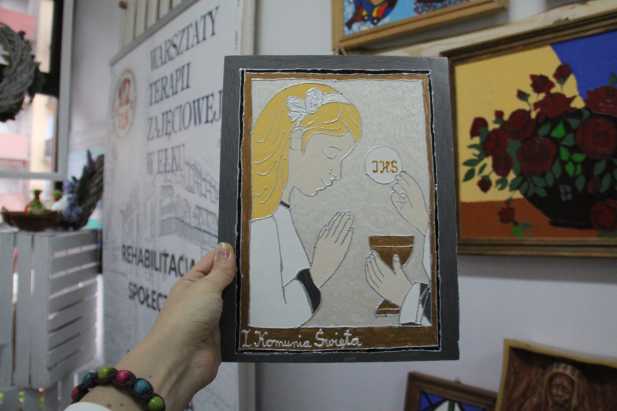 Haftowany Pan Jezus dźwigający ciężki krzyż, jest też Jezus w cierniowej koronie rysowany na szkle, życzenia miłego dnia, wyznania miłości w formie magnesów. Gdzieś w rogu przepiękne kolorowe kwiaty z bibuły zdobią kartę. Radosny anioł gra na trąbie, w wielu pracach widać ogromne przywiązanie i miłość do naszego miasta. Obok stroskana Matka Boża tuli małe Dzieciątko, tuż za nią kobieta z pasją pali papierosa delektując się dymem. Obrazy świętych, kartki świąteczne, bombkami, rzeźby, pełne finezji i kreatywności to tylko nieliczne produkty z pośród propozycji możliwych do nabycia.