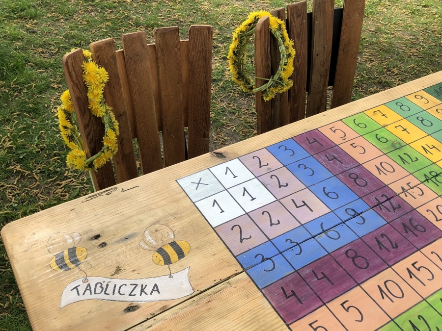Tabliczkę mnożenia zaprojektował i wykonał na nasze zlecenie utalentowany ełczanin - Michał Gużewski. Malowanie na drewnie to nie lada wyzwanie, w dodatku bardzo pracochłonne. Michał włożył w nią mnóstwo pracy, serdecznie dziękujemy. Bardzo cieszymy się, że są jeszcze ludzie, którzy chcą działać lokalnie i projektować swoje miejscowości. Tabliczka już po kilku minutach od montażu cieszyła sie zainteresowaniem najmłodszych.